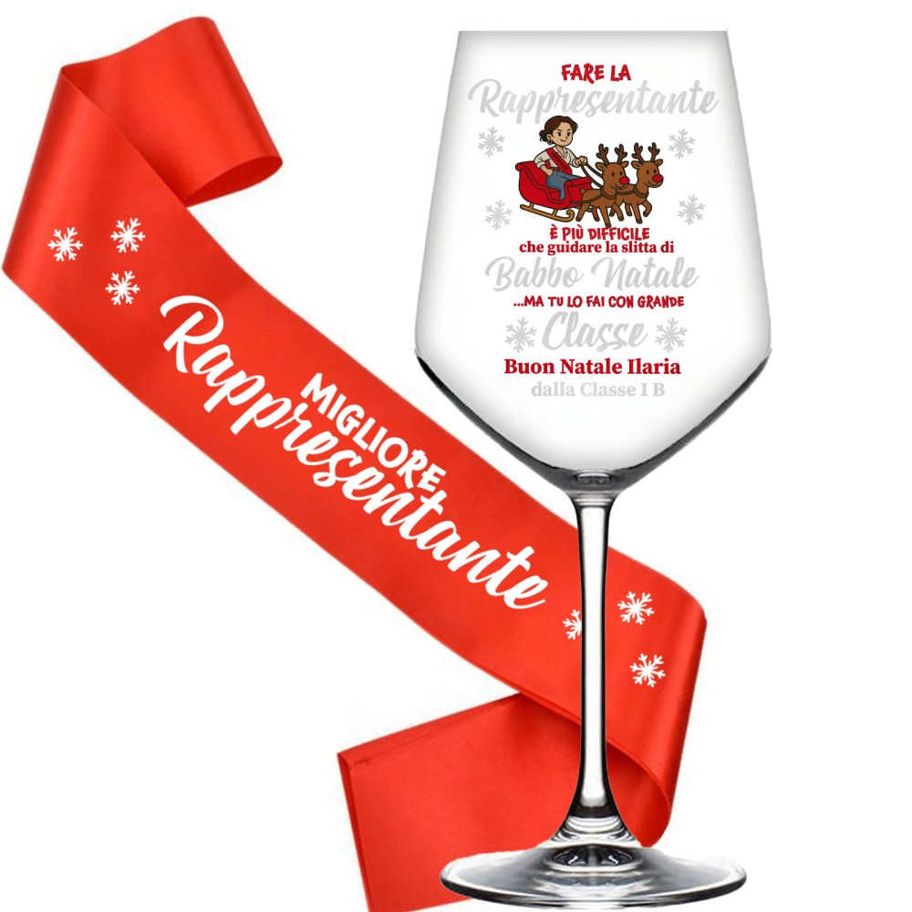 Il set “Migliore Rappresentante” comprende un elegante calice in vetro personalizzato e una fascia rossa nataliziacoordinata, perfetti per dire grazie con stile e simpatia.