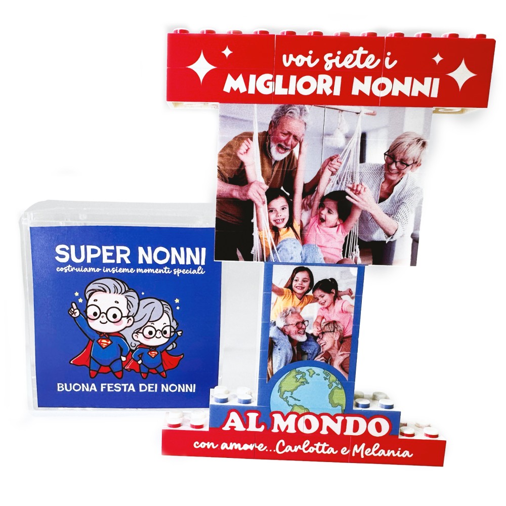 Per i migliori nonni al mondo il regalo ideale è questo trofeo di mattoncini personalizzato con foto e testo.Questo regalo unico è arricchito dalla bellissima confezione in plexiglass con la scritta Super Nonni, costruiamo insieme momenti speciali! Un regalo da costruire insieme, pezzo dopo pezzo, per continuare a vivere insieme momenti indimenticabili.