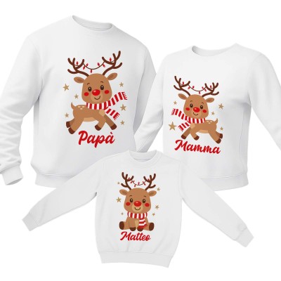 Il completo include tre felpe bianche girocollo – una da uomo, una da donna e una da bambino (in alternativa è possibile scegliere il body) – perfettamente abbinate per un look festivo unico e divertente.