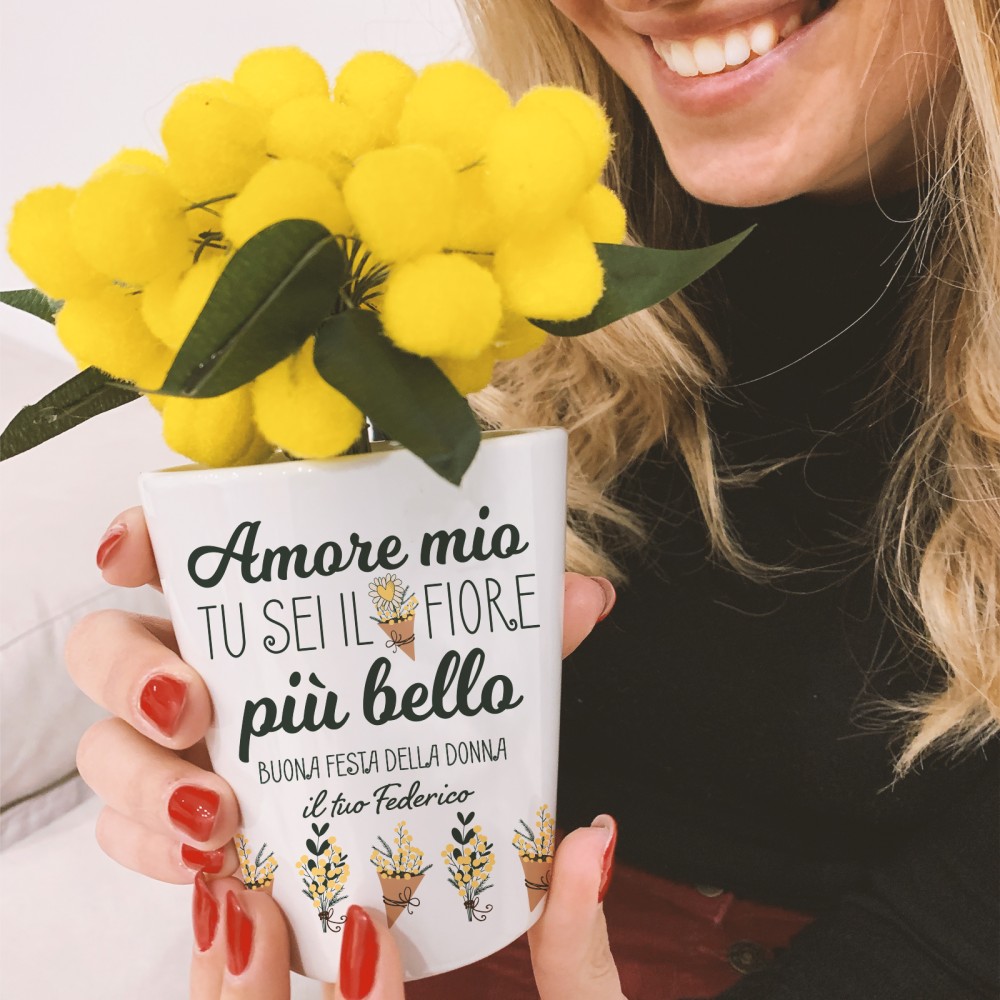 Vasetto Ceramica Personalizzato con Mimosa artificiale