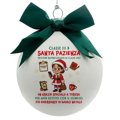 La pallina “Santa Pazienza” è dedicata a chi, con il sorriso, gestisce più emergenze di Babbo Natale: un pensiero originale per qualsiasi rappresentante di classe che si è distinta per pazienza, organizzazione e spirito natalizio.
