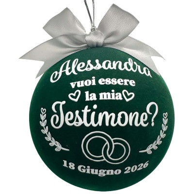 Questa raffinata pallina in velluto verde con scritta bianca è un modo unico e dolce per chiedere: “Vuoi essere la mia testimone?”