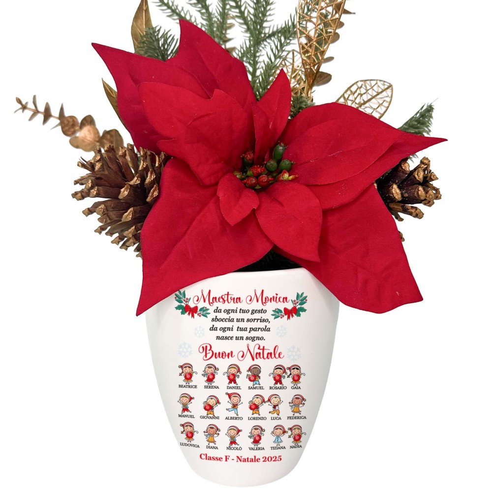 Questo elegante vaso bianco in ceramica è personalizzato con il nome della maestra, una dedica speciale e i nomi degli alunni, accompagnato da una stella di Natale artificiale decorata con pigne, bacche e foglie dorate.