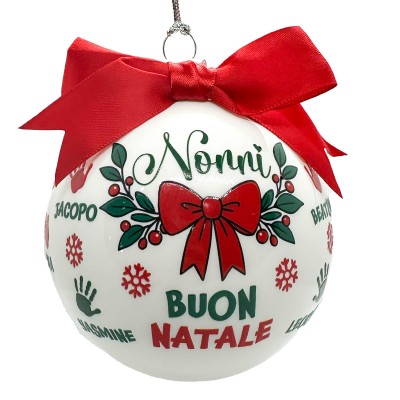 Questa pallina di Natale personalizzata è realizzata in vetro bianco lucido e decorata con la scritta “Nonni buon Natale ”, colorati disegni natalizi e le impronte e i nomi dei nipoti