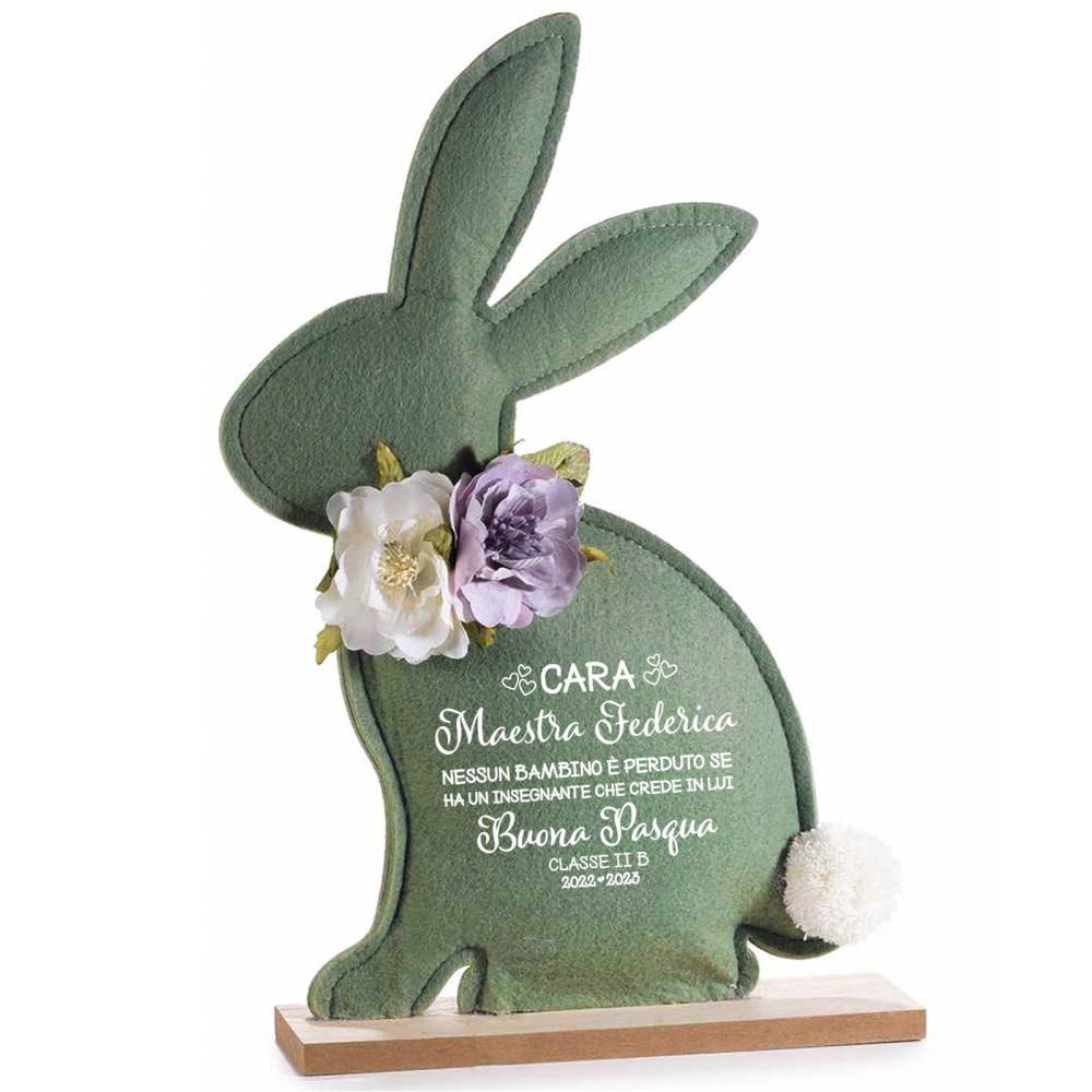 Porta Gift Card in legno con la scritta "Buon Pasqua ". Personalizzata con il nome della maestra e della classe. Al centro, c'è uno spazio che permette l'inserimento della gift Card....